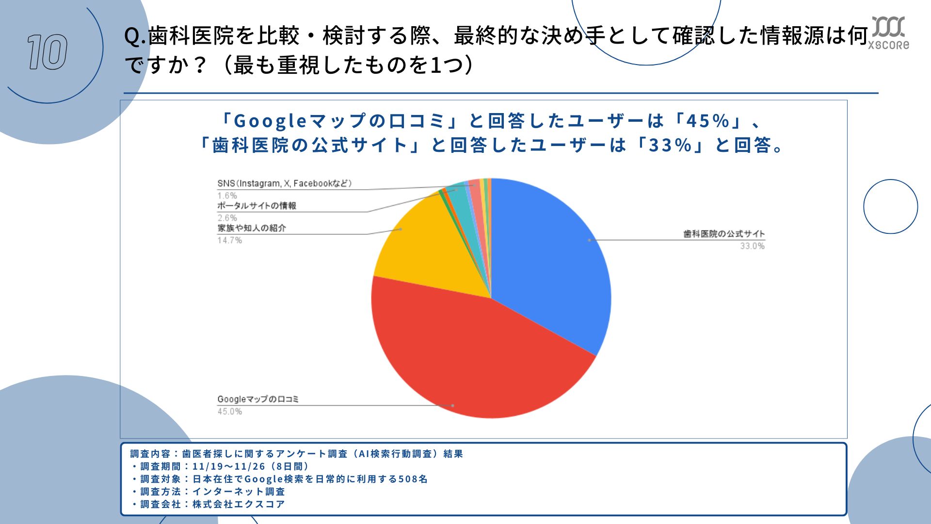 「Googleマップの口コミ」と回答したユーザーは「45%」、「歯科医院の公式サイト」と回答したユーザーは「33%」。