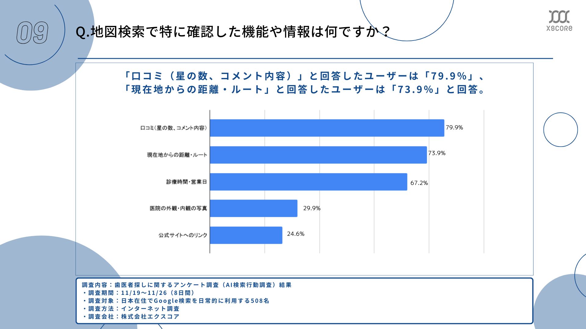 「口コミ(星の数、コメント内容)」と回答したユーザーは「79.9%」、「現在地からの距離・ルート」と回答したユーザーは「73.9%」。
