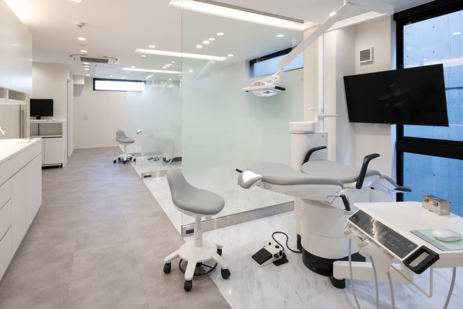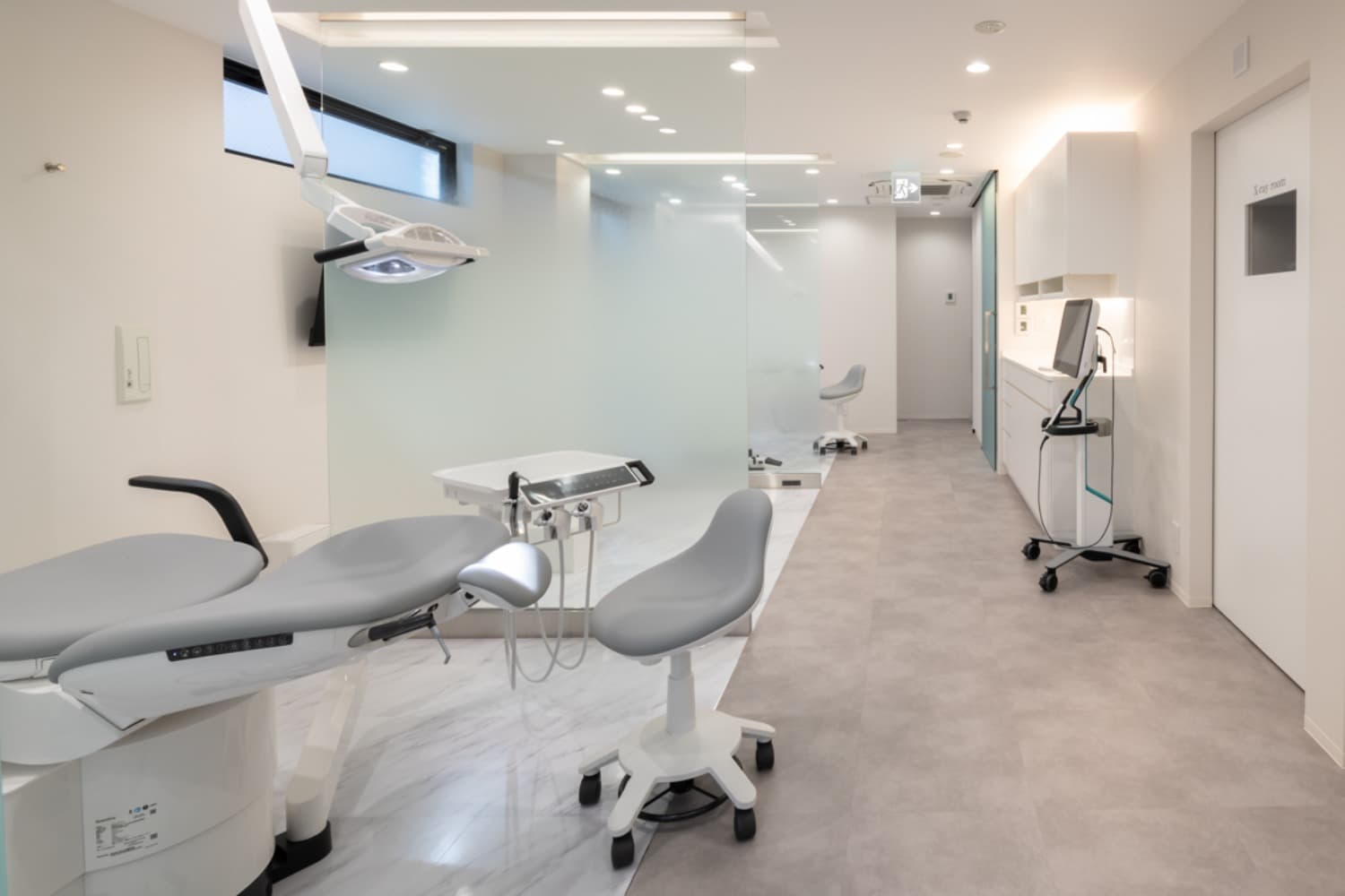 白とグレーを基調とした診察室です。説明用のモニターを各チェアに設置しています。