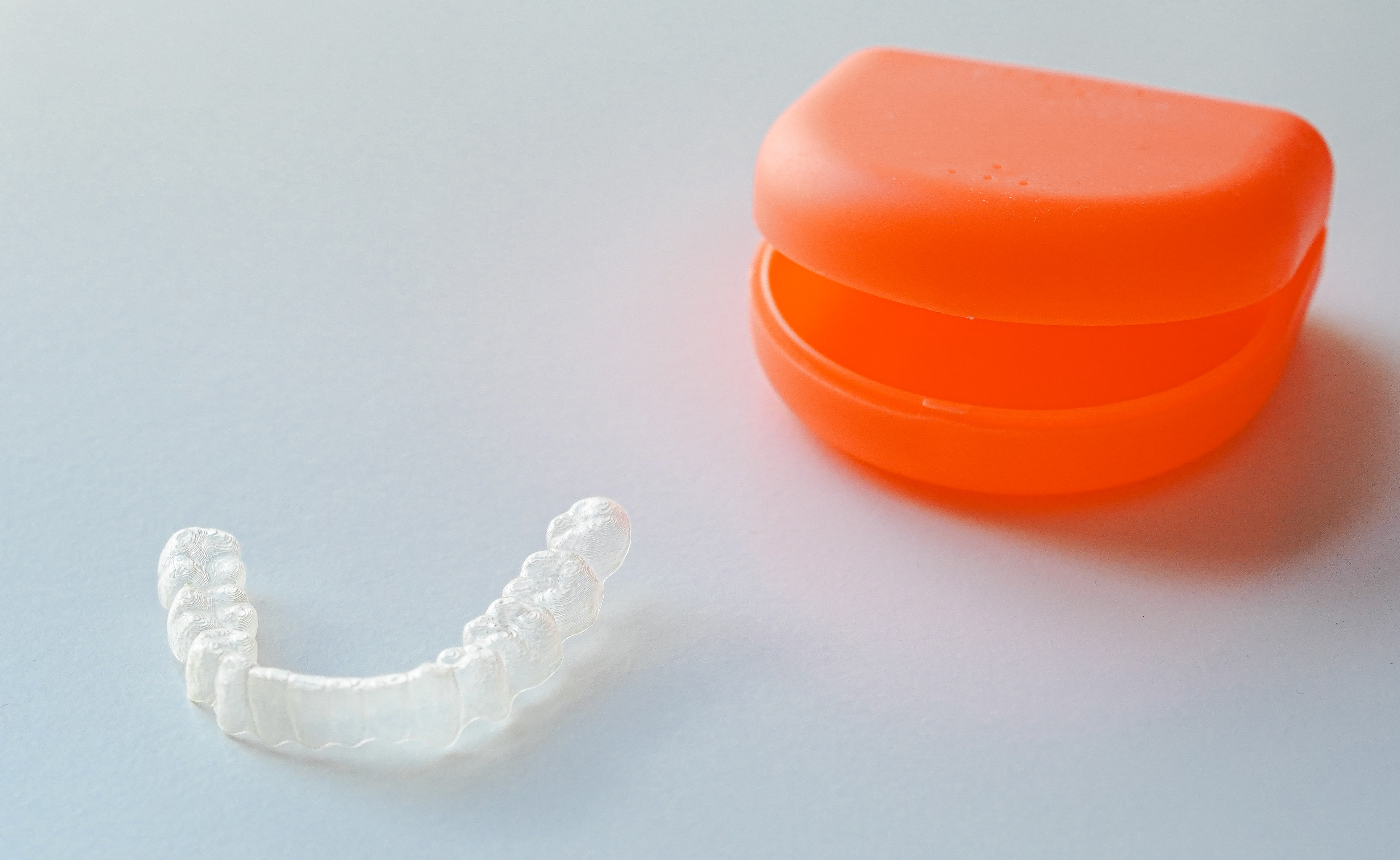 透明で軽いマウスピースを用いるため見た目の影響を抑えられ、お口に着けたときの違和感も少ないです。