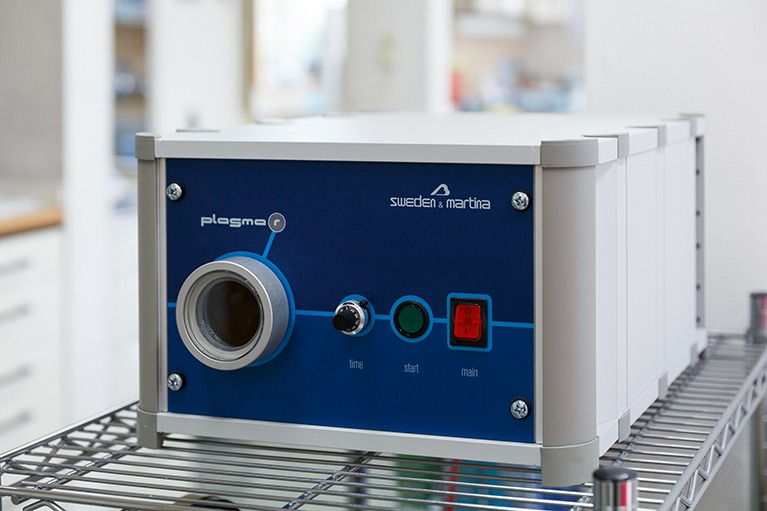プラズマを使って被せ物や詰め物、インプラントなどをきれいにし、装着後の安定性や安全性を高めています。