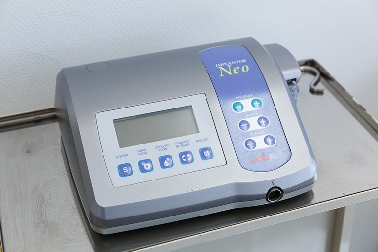 インプラントを埋入するための機器です。安全な処置をおこなうため、コンピューター制御で患者さんの骨の状態に合わせたドリルの回転数を適用します。