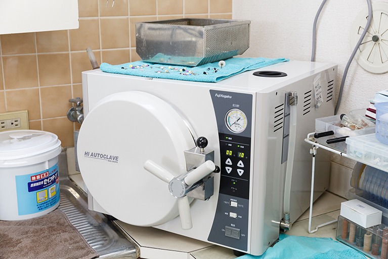 高圧の蒸気で治療器具を滅菌するための機器です。使い捨てにできない治療器具はこの機器を用いて徹底的に滅菌処理しています。