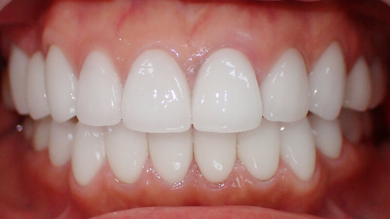 治療内容 | テトラサイクリン歯と変色した差し歯に対して、まとめてセラミック治療をおこなうことで、透明感のある白い歯に仕上げました。 |