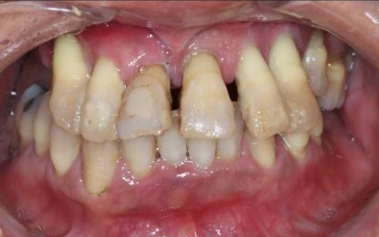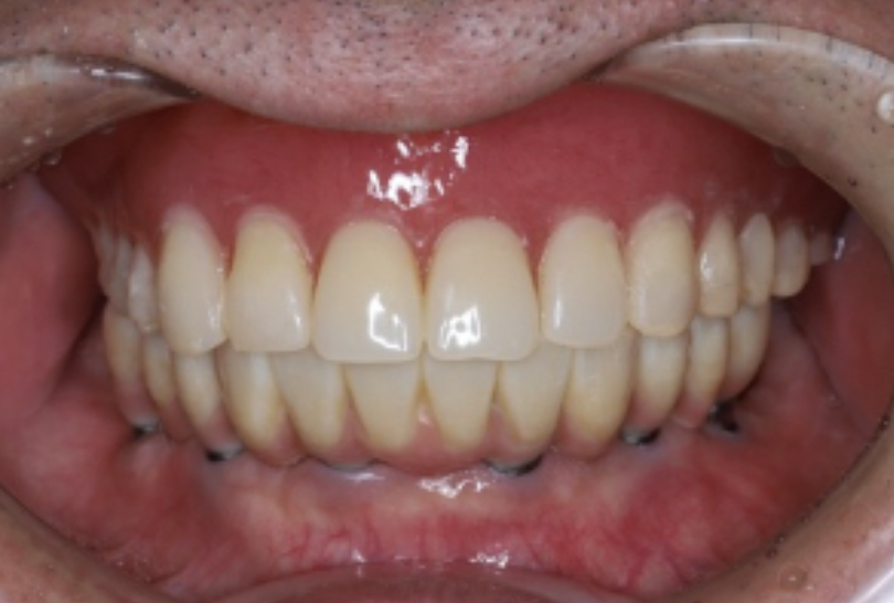 治療内容 | 上下顎に残存していた歯が約20本ありましたが、動揺が強く保存が困難だったため、上下顎の残存歯をすべて抜歯しました。下顎は顎骨にインプラントを6本埋入し、その上に固定式の人工歯(インプラント補綴)を装着して咀嚼機能の回復を図りました。上顎は総義歯(総入れ歯)を作製・装着し、見た目と機能面の回復を行いました。 |