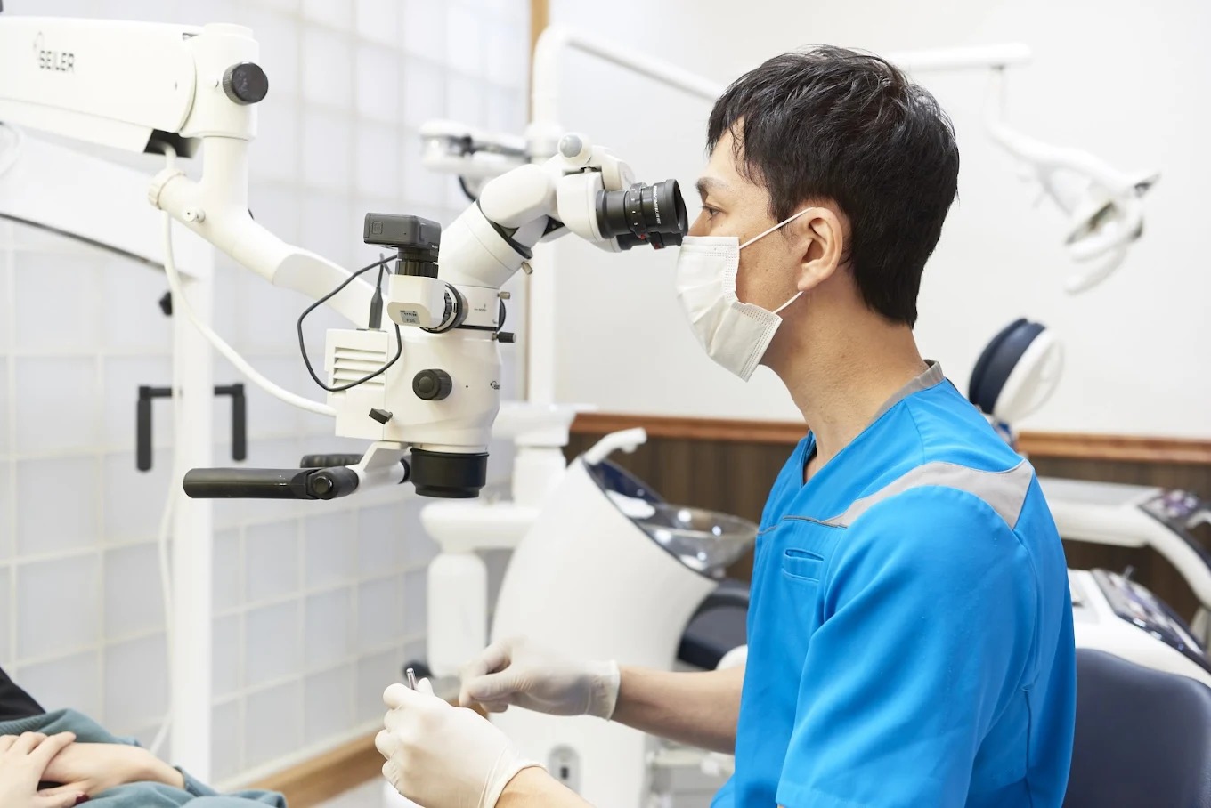 最大20倍まで対象を拡大して観察できる歯科用顕微鏡(マイクロスコープ)です。肉眼では確認できない細かな部分も鮮明に見ることができ、極めて精密な治療を実現します。